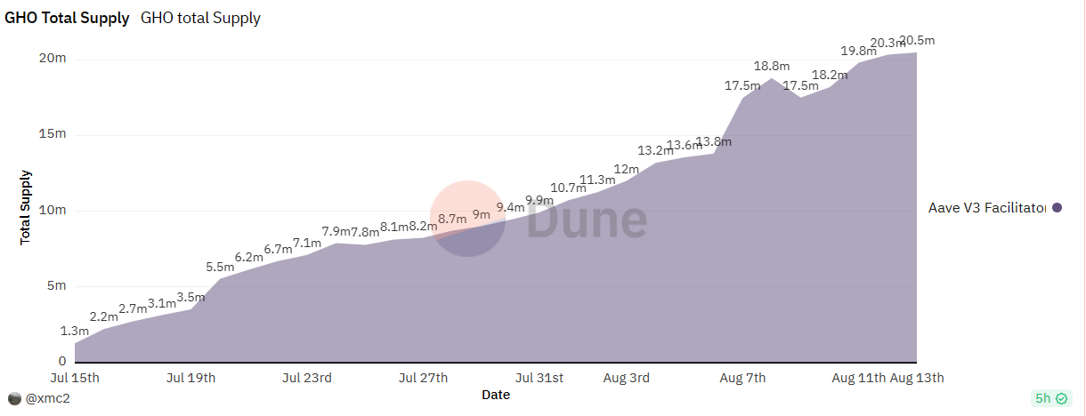 ChainCatcher 此前報導,8 月 2 日,Aave 推出的去中心化穩定幣 GHO 鑄造量突破 1000 萬枚。