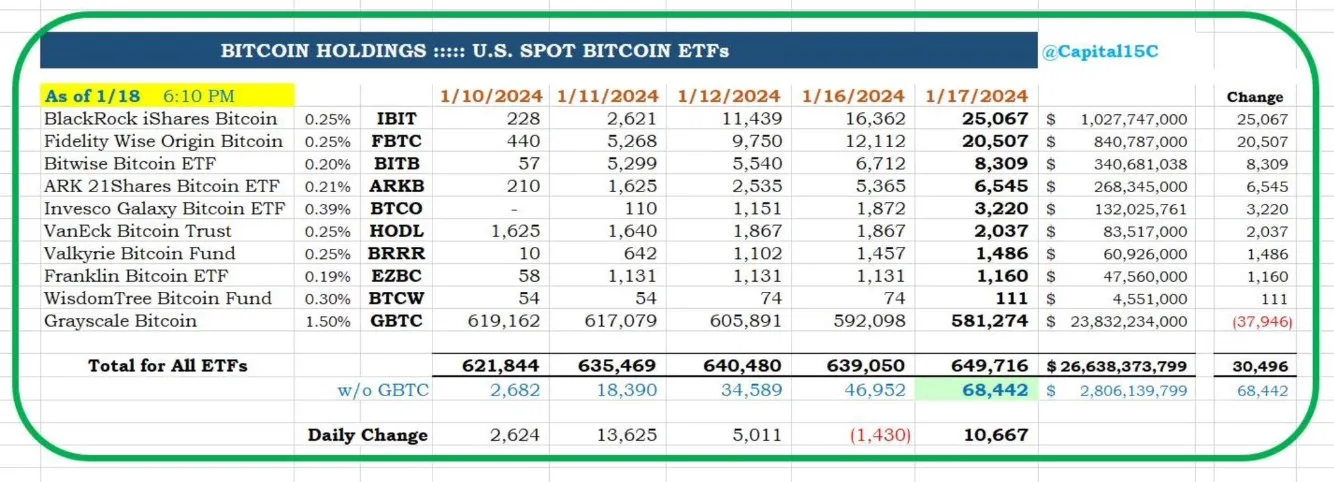 數據還顯示,9 隻 ETF(不包括灰度)自推出以來已經購買了近 68500 枚 BTC,目前價值約 28 億美元。與 ETF 相關的比特幣買入被 Grayscale 比特幣信託基金(GBTC)的流出部分抵消,該基金賣出了10,824 枚 BTC,價值約 4.45 億美元。自 1 月 11 日 GBTC 轉為現貨 ETF 以來,已有近 38,000 枚 BTC 流出。