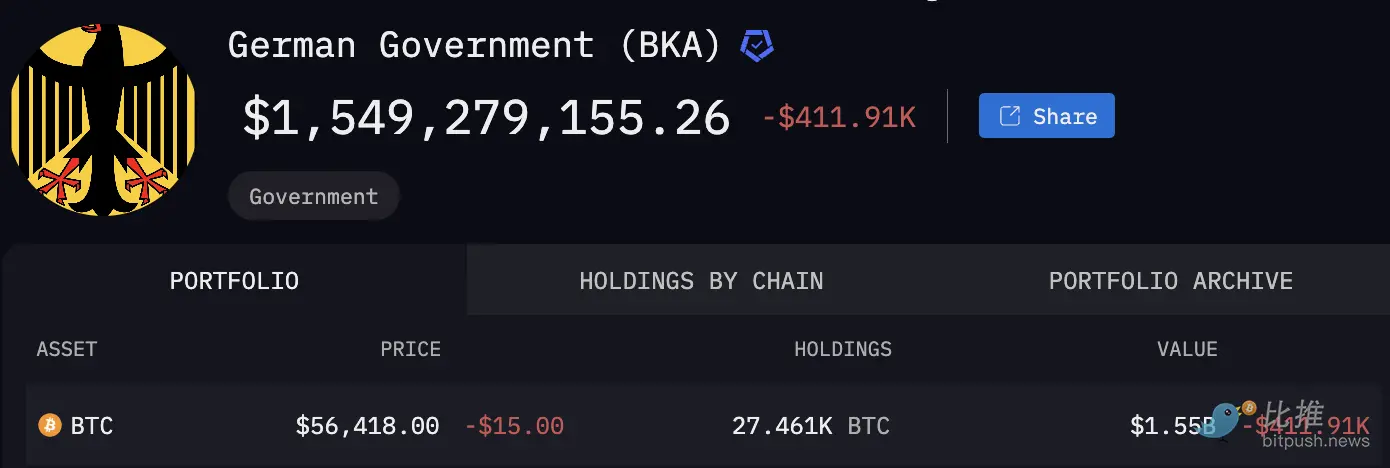 根據 Arkham 的數據,德國政府的拋售進度已完成近一半,自上個月開始拋售以來,其 BTC 持有量從近 50,000 枚減少至 27,461 枚,當前持倉價值 15 億美元。