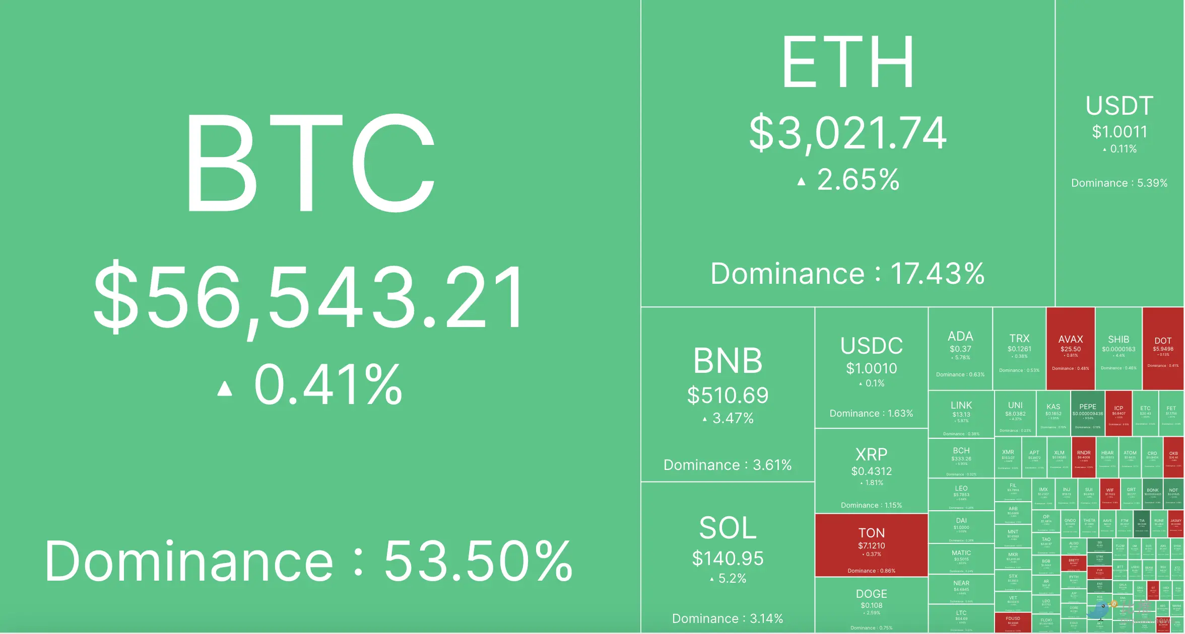 比推數據顯示,BTC 在週一下午早些時候觸及約 55,200 美元,隨後於美股收盤後反彈至 56,662.40 美元,24 小時漲幅 0.58%。