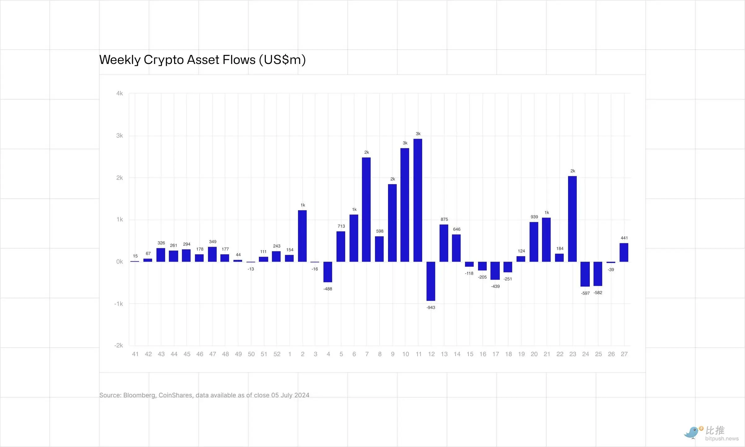 儘管市場下跌,CoinShares 發布的數據顯示,上週數字資產投資產品的流入金額達到 4.41 億美元。