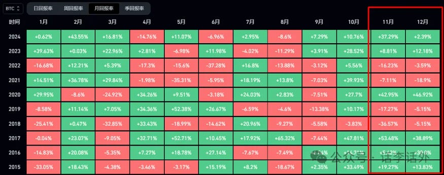 那麼我們這裡簡單做個假設,假設這種 Seasonality 今年繼續會重複,那麼根據往年 12 月份平均表現的 12% 左右漲幅來看,今年 12 月份比特幣的理論收盤價格差不多就是在 107,500 美元左右。這就意味著,除非是接下來這幾天出現什麼新的黑天鵝事件讓比特幣暴跌,否則不會改變什麼整體趨勢。當然,這個 Seasonality 維度不夠嚴謹,因為歷史不能 100% 準確代表現在和未來,我們就當做一種簡單參照即可。