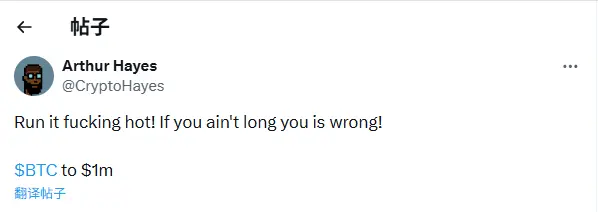ChainCatcher 消息,BitMEX 聯創 Arthur Hayes 在 X 平台發文表示,BTC 的價格將達到 100 萬美元。
